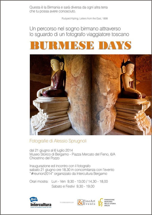 Dal 21 giugno al 6 luglio 2014 Fine Art and Events, in collaborazione con Intercultura onlus e Fondazione Bergamo nella Storia ha organizzato, presso il Museo Storico di Bergamo in Piazza Mercato del Fieno 6/A (Chiostrino del Pozzo) la mostra fotografica di Alessio Sprugnoli "Burmese Days" - un percorso fotografico nel sogno birmano attraverso gli scatti del bravo fotografo viaggiatore livornese.