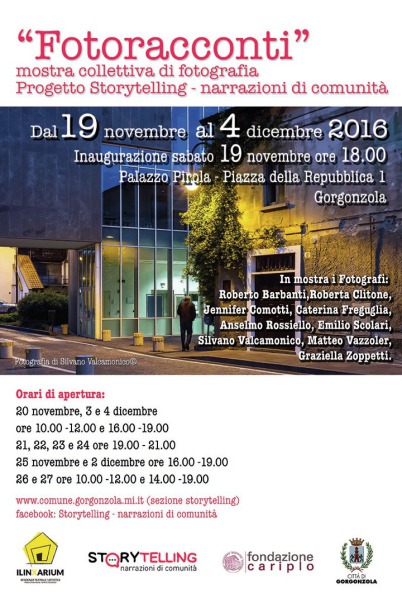 Dal 19 novembre al 4 dicembre 2016 si terrà, nella splendida cornice di Palazzo Pirola a Gorgonzola (MI), la mostra fotografica collettiva "Fotoracconti" - progetto storytelling narrazioni di comunità.